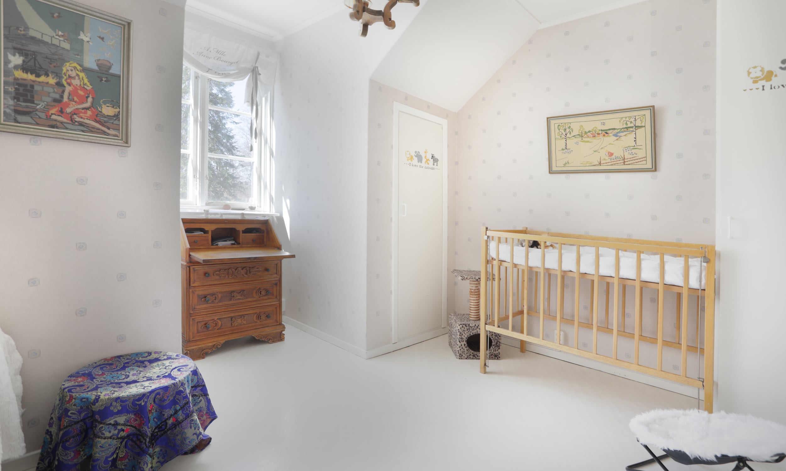 Övervåning Övervåningen har 6 st sovrum i varierad storlek. På övervåningen finns även två badrum. Det ena badrummet är utrustad med wc, badkar och tvättställ. Våtrumsmatta och våtrumstapet. Det andra badrummet har utrustats med wc, tvättställ, duschkabin och två st extra förvaringsskåp. Våtrumsmatta och våtrumstapet. Stor möblerbar hall och ett genomgångsrum där man kan möblera funktionellt och vackert.